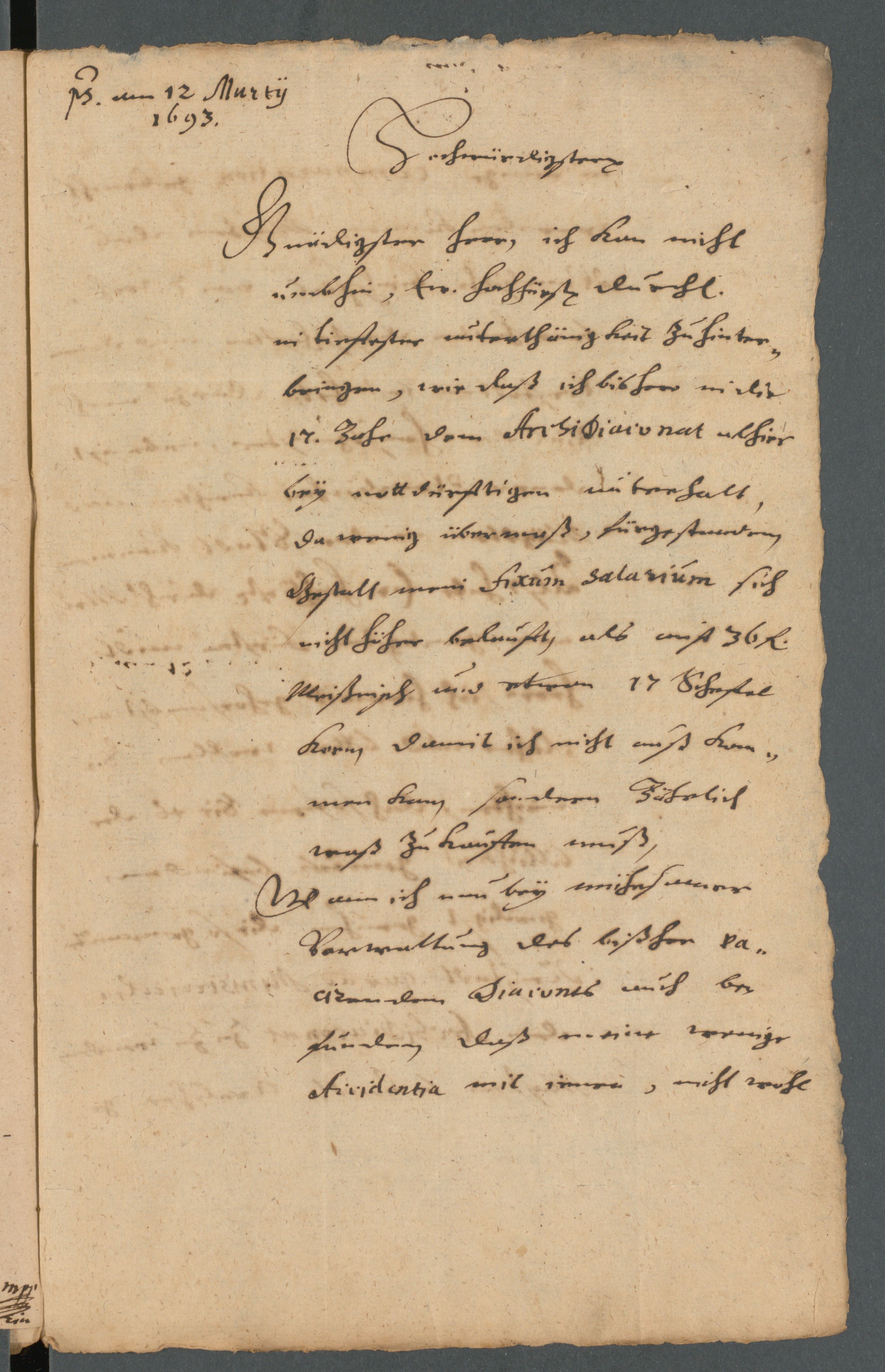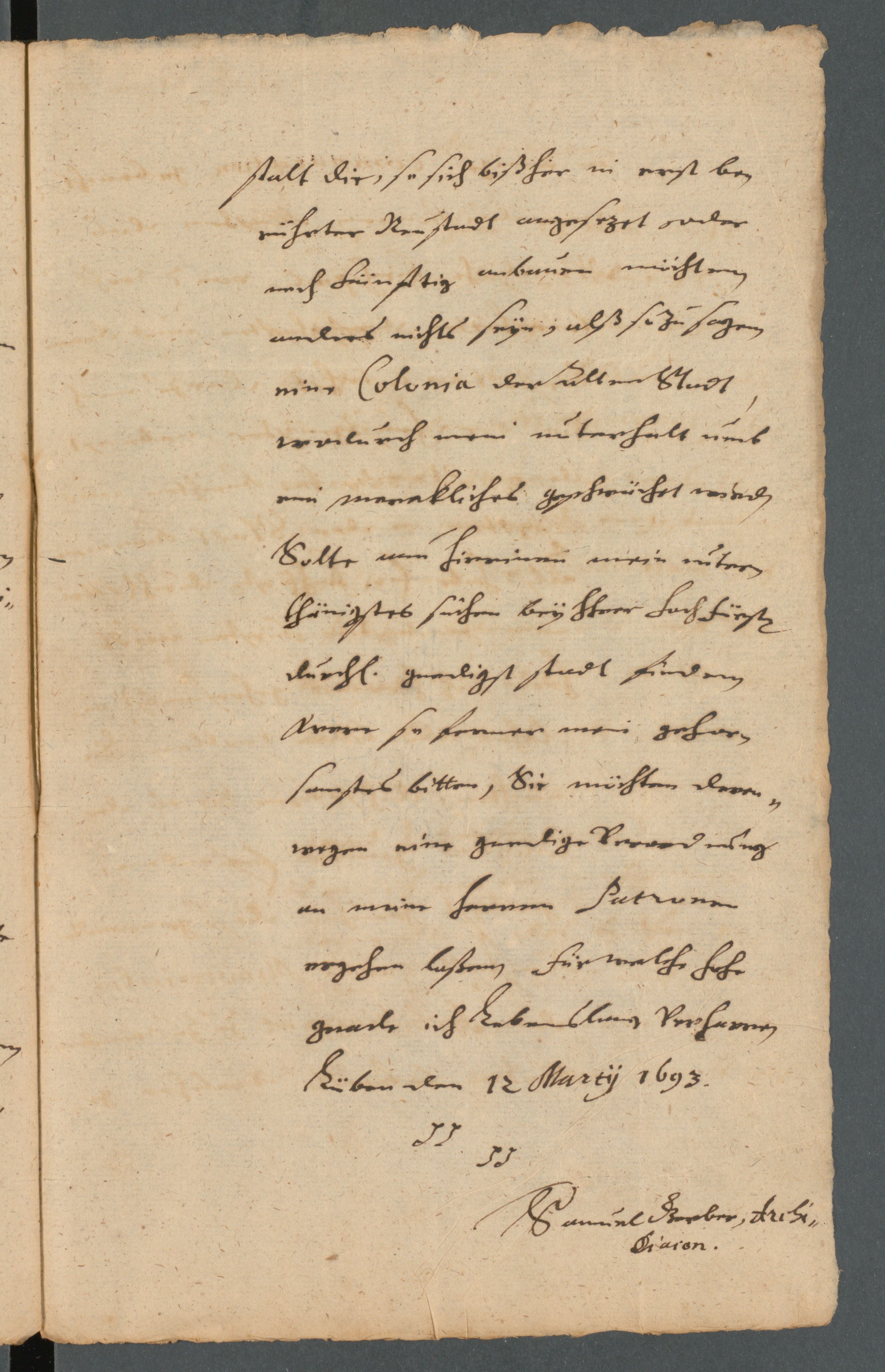 Samuel Gerber, Archidiakon in Lübben, bittet den Generalsuperintenden Daniel Römer und den Rat zu Lübben, ihm die Lübbener Neustadt als Seelsorgebezirk zu übertragen.