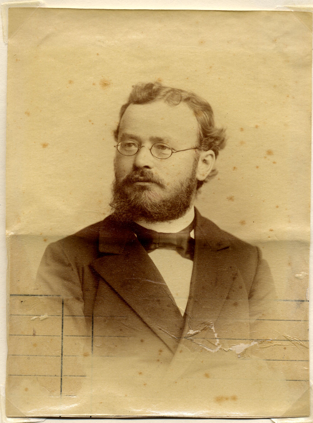 Porträt von Arnošt Muka. Mittelalter Mann mit Brille, dunklem Haar und dunklem Bart. Er trägt eine dunkle Jacke und eine Fliege.